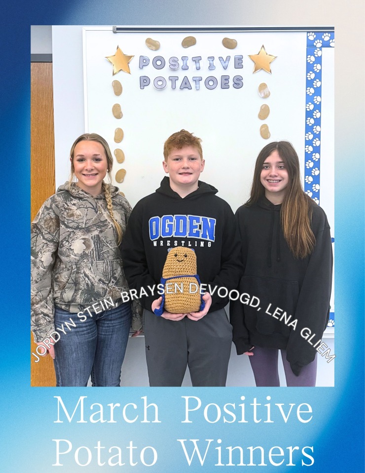 Positive Potato is Ogden Middle School's version of Student of the Month with an extra fun title! One student is awarded from each grade. The students are selected by the adults in the building based on these character traits: respect, responsibility, trustworthiness, caring, and always trying to improve. The Positive Potato recipients this month are: