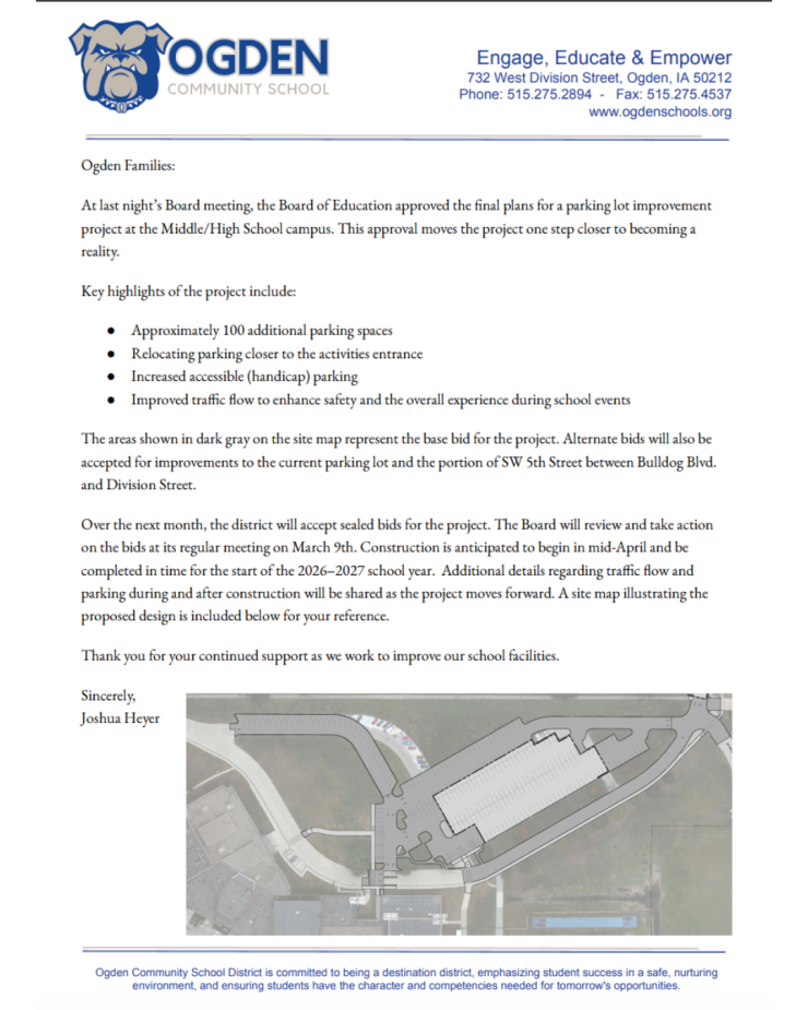 ๐ง Exciting improvements ahead! ๐ง The Ogden Board of Education approved a MS/HS parking lot project ๐ ฟ๏ธ adding ~100 new spaces, improved accessible parking, and safer traffic flow for events. Construction begins mid-April and will be completed before the '26–27 school year! ๐พ๐